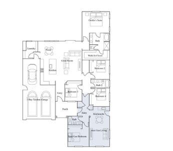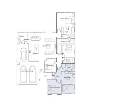 Largest design with a Next Gen® suite (separate entry + living space + kitchenette + bedroom) plus spacious main-home living areas and a 3-bay garage.