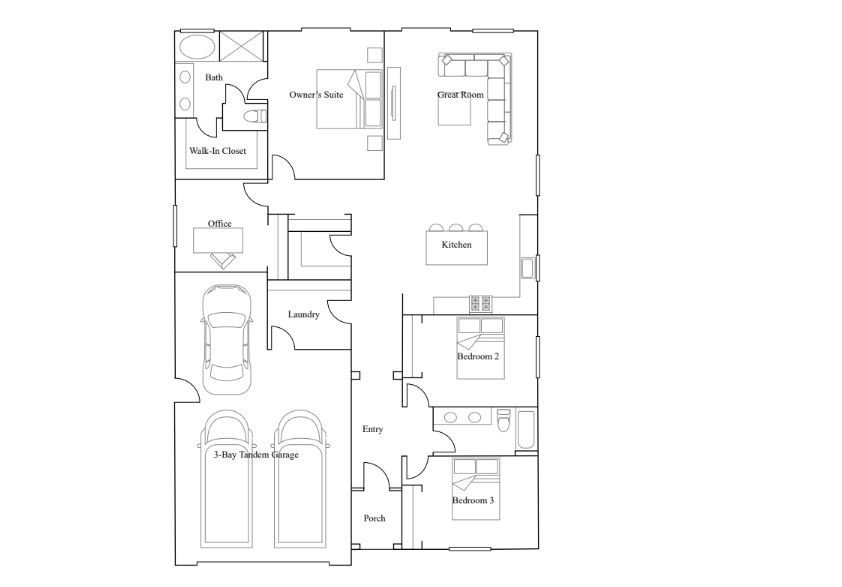 Single-story layout with an open Great Room + dining + kitchen flow, plus a 3-bay garage and flexible storage space.